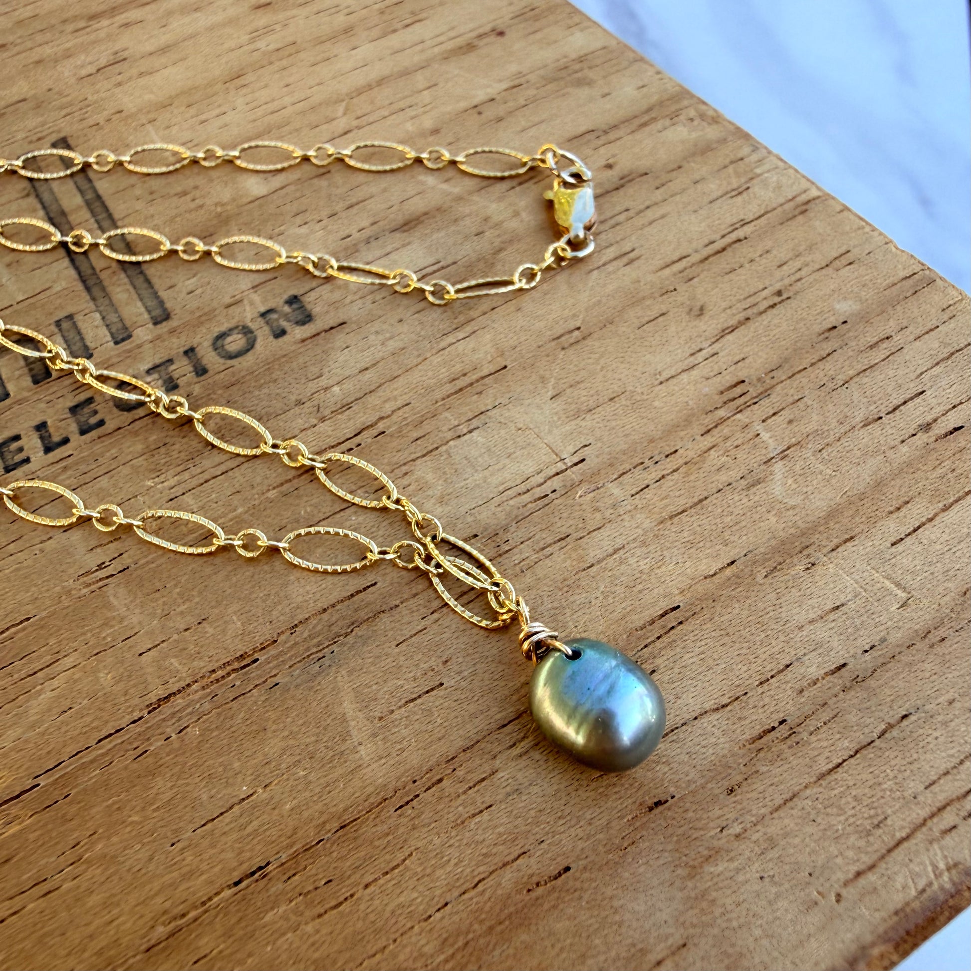 Perla verde de agua dulce en cadena llena de oro