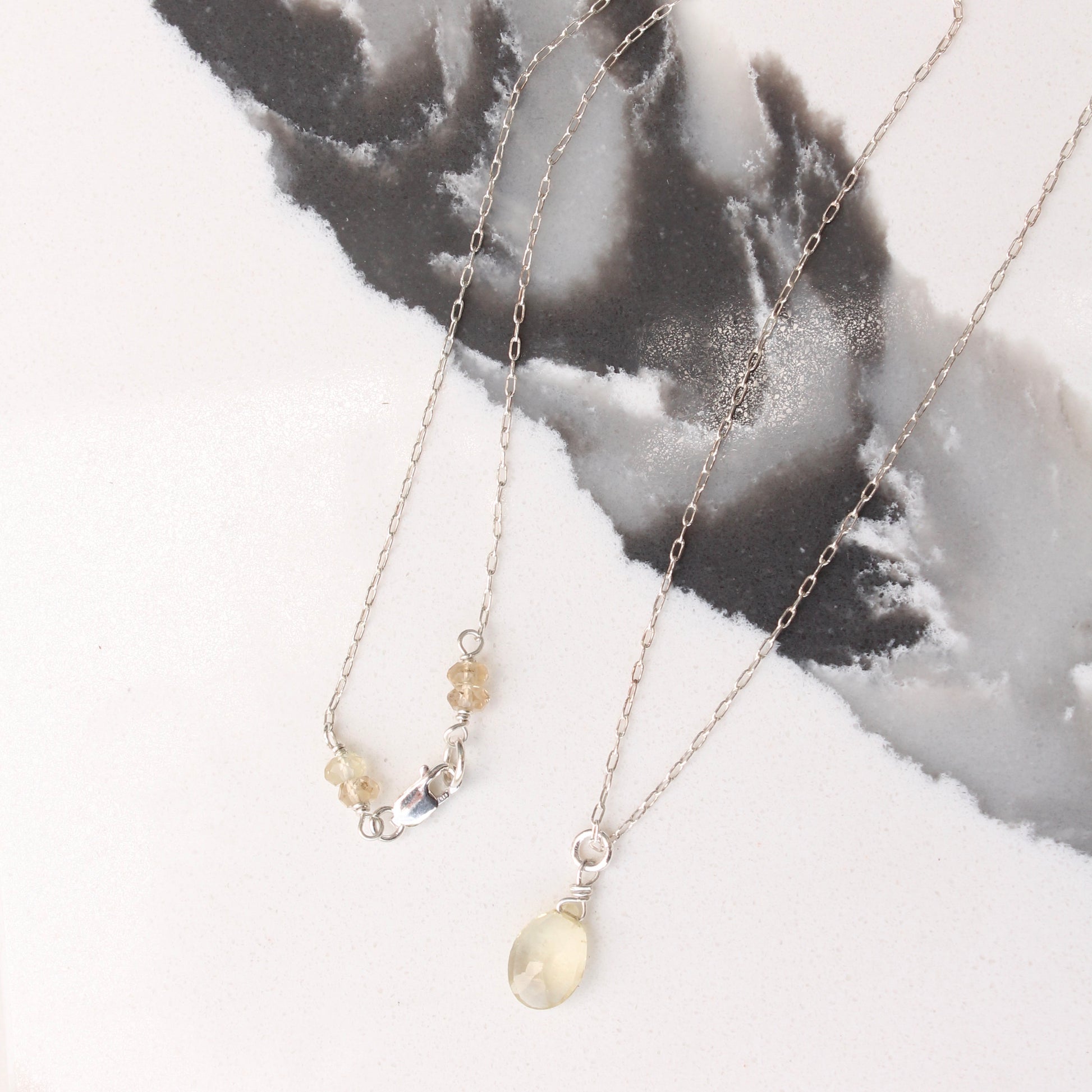 Una simple gota de cuarzo limón es elegante y sencilla para el verano. La cadena de plata de ley es estilo Figaro para mayor elegancia. El oro lleno es una fina cadena tipo cable. Ambos miden 18" de largo. La caída de briolette es de ~12 mm.
