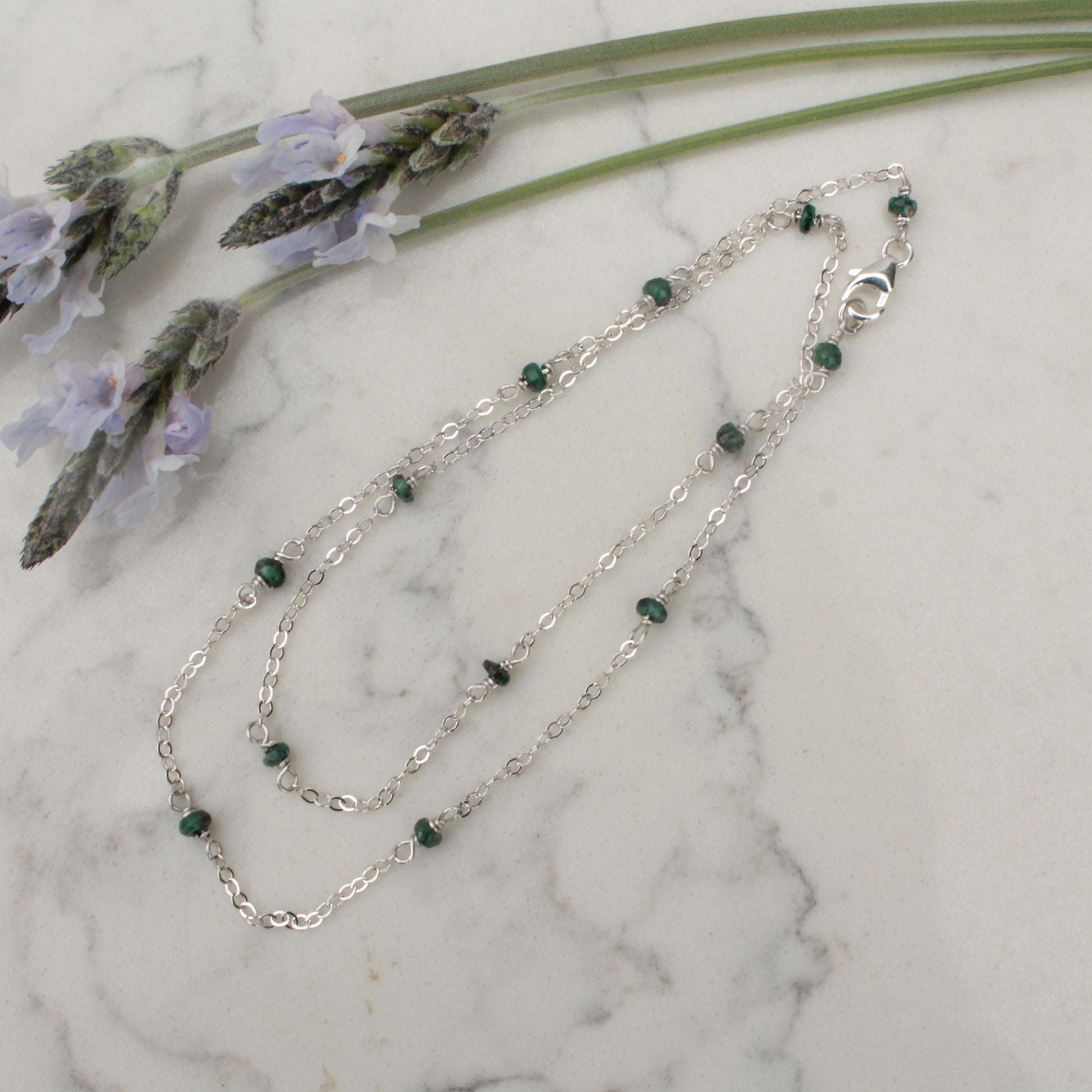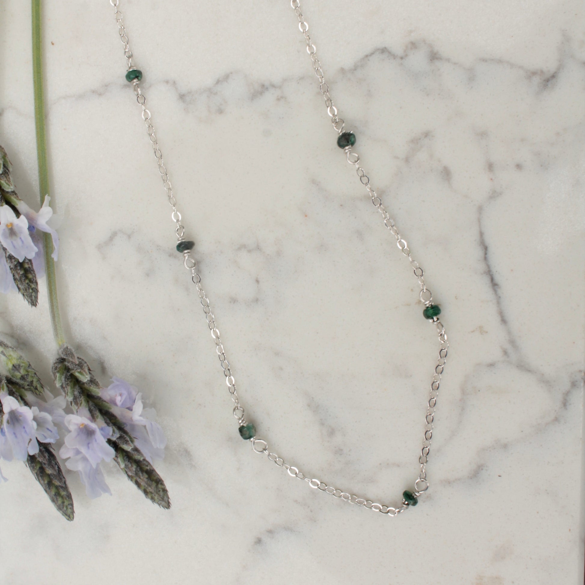A simple, delicate necklace combines tiny emerald rondelles and fine cable chain. The amethysts are spaced at 1 inch all the way around for a total length of 17 inches. This is an everyday necklace that you can wear all year long and perfect for layering. It makes a great May birthday gift! Choose gold filled or sterling silver chain.