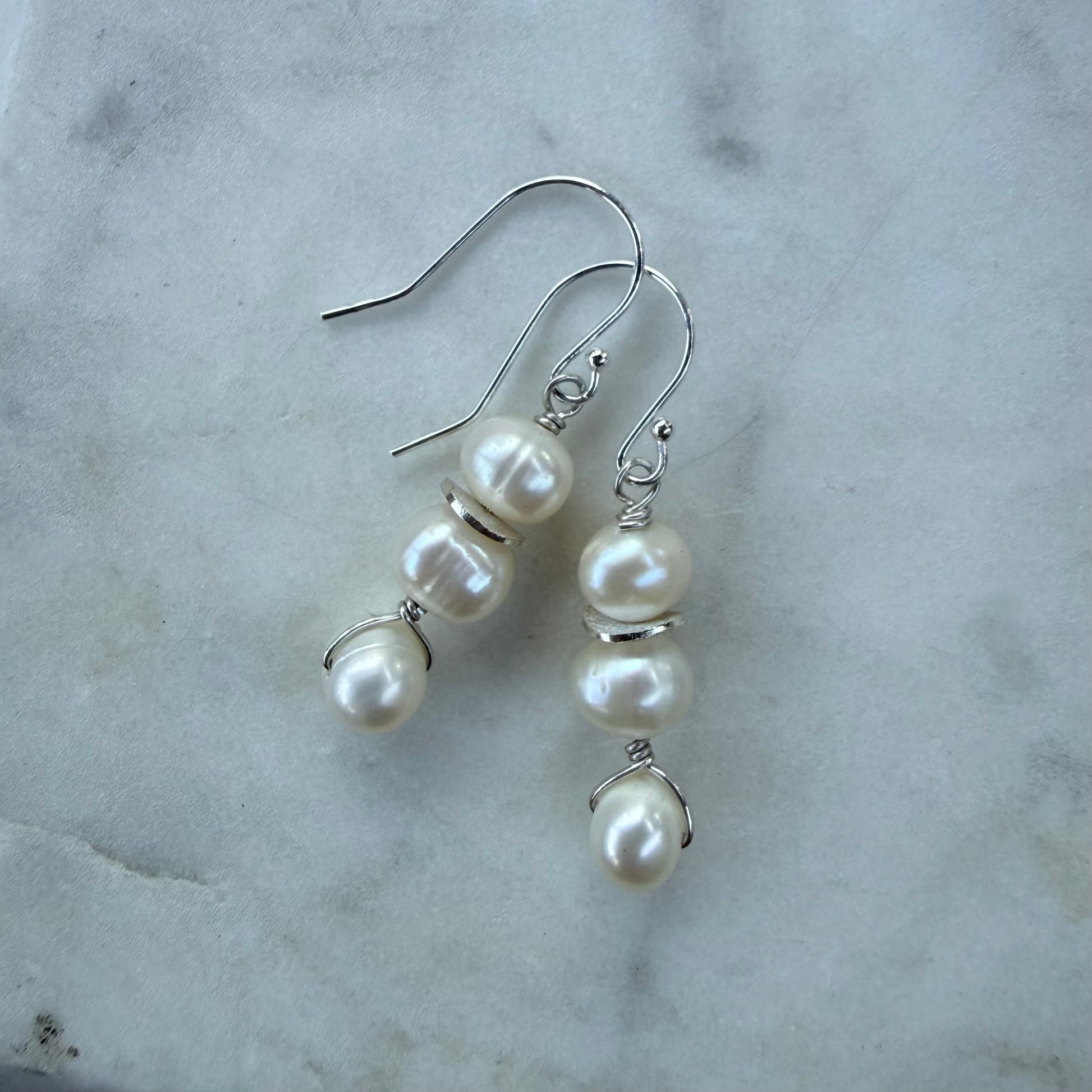 Handcrafted from smooth, white, fresh water pearls and intricately wire-wrapped, these earrings exude luxury and elegance. The three pearls are delicately suspended in tandem, creating a one-of-a-kind piece. Expertly crafted with sterling silver wire, or gold filled, these earrings are a favorite design that exudes sophistication.