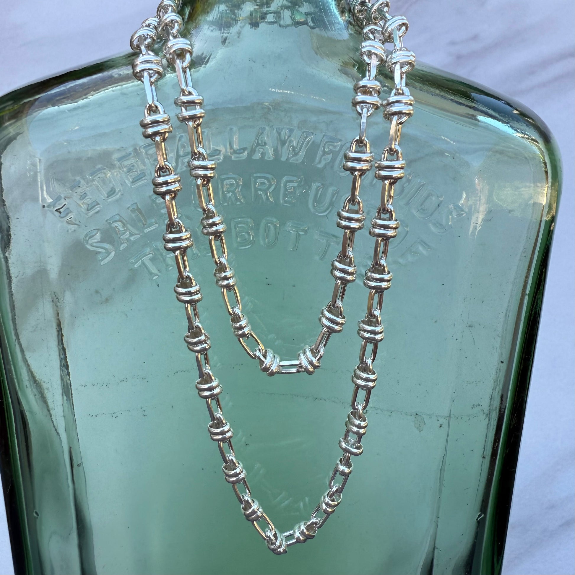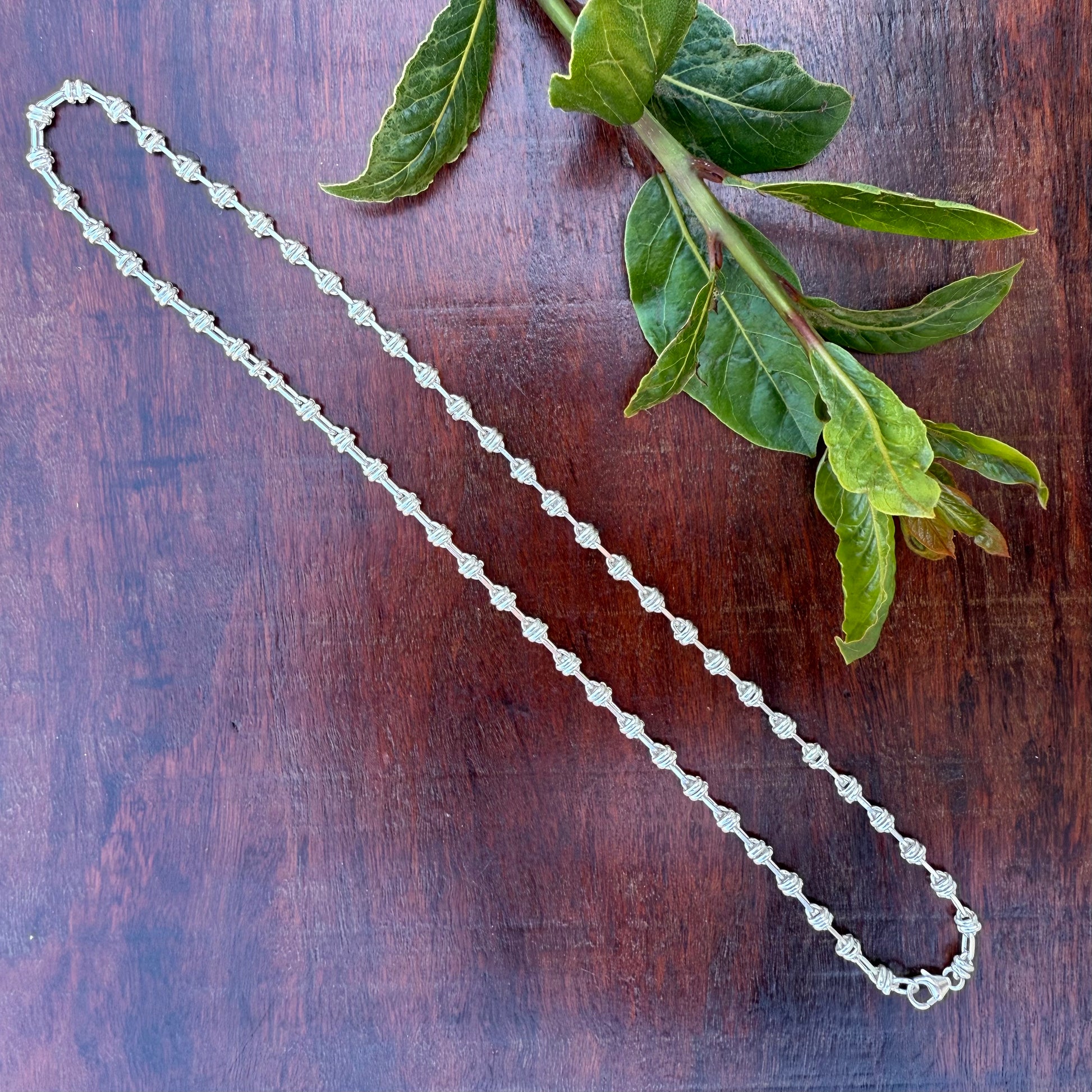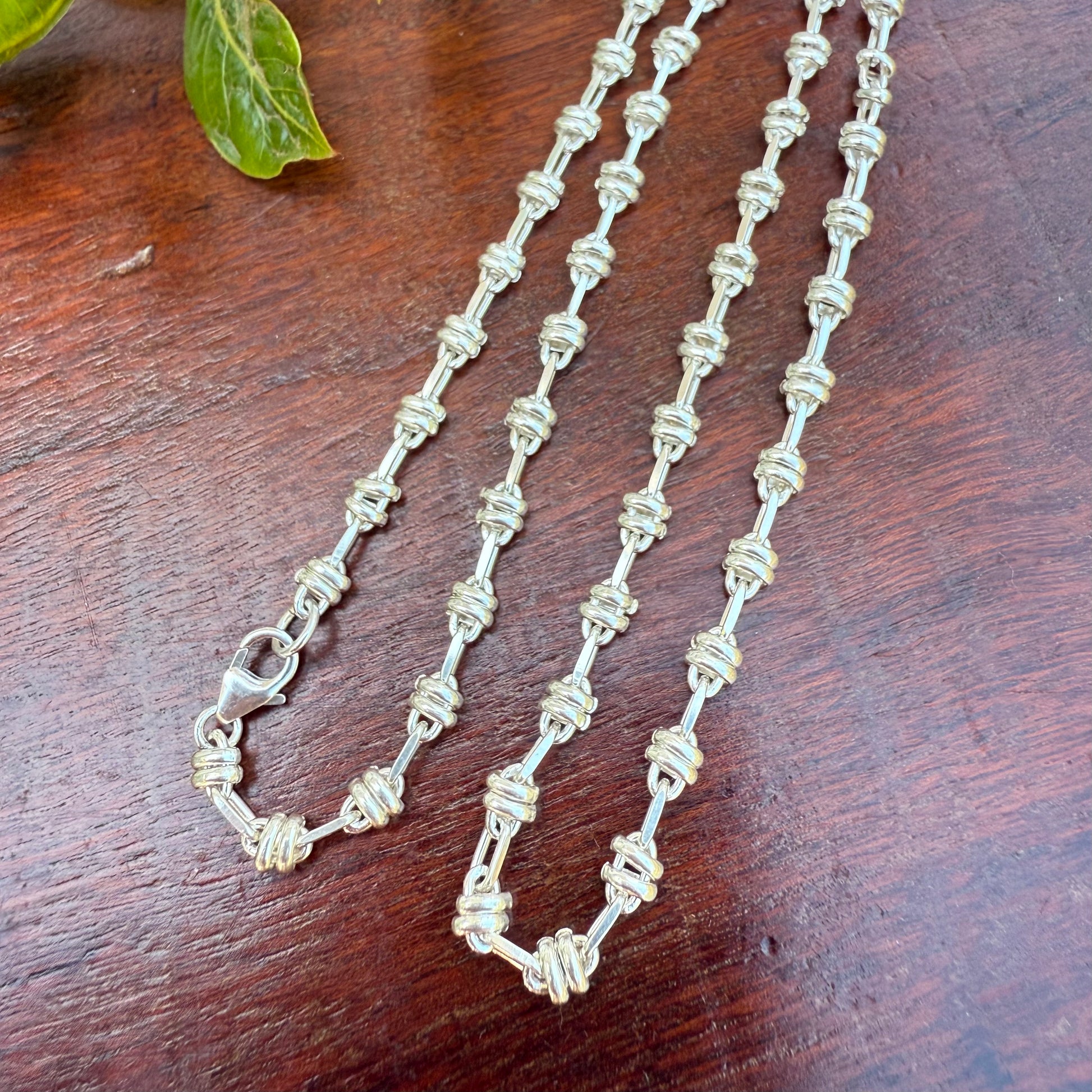Celebrate timeless style with this sterling silver love knot chain, a design that balances elegance with strength. Each link is carefully formed into a love knot—an enduring symbol of connection and unity—then joined with smooth bar connectors for a distinctive, textured look.